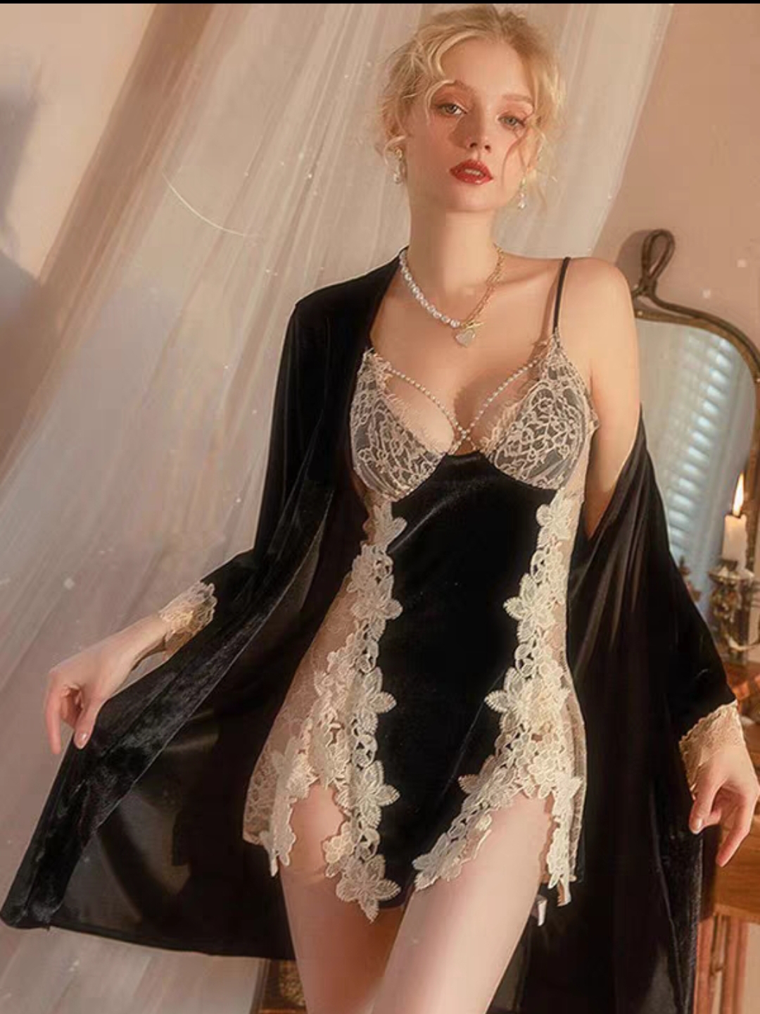 维多利亚蕾丝拼接性感丝绒睡衣女纯欲风吊带睡裙睡袍带胸垫家居服