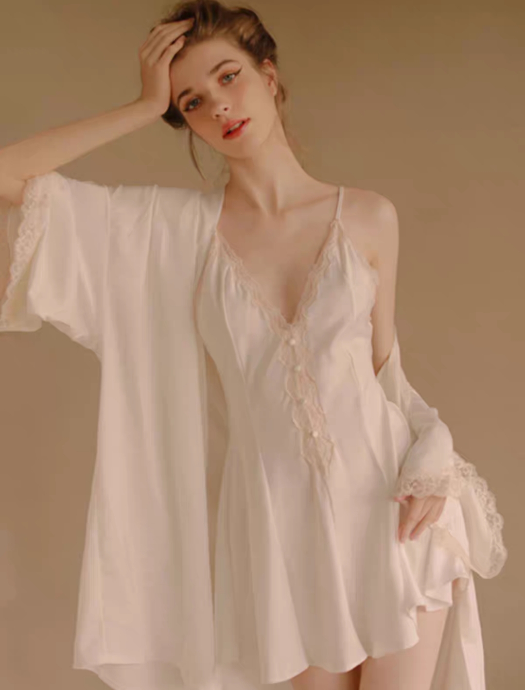 性感睡裙女2026新款绝美真丝睡衣深V小胸带胸垫蕾丝吊带睡袍套装
